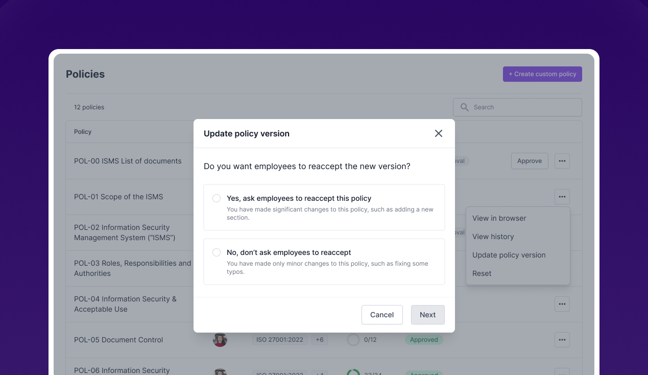 We've added more flexibility when updating policies! Now, when uploading a new version of a policy, you can decide whether employees need to reaccept it or not.