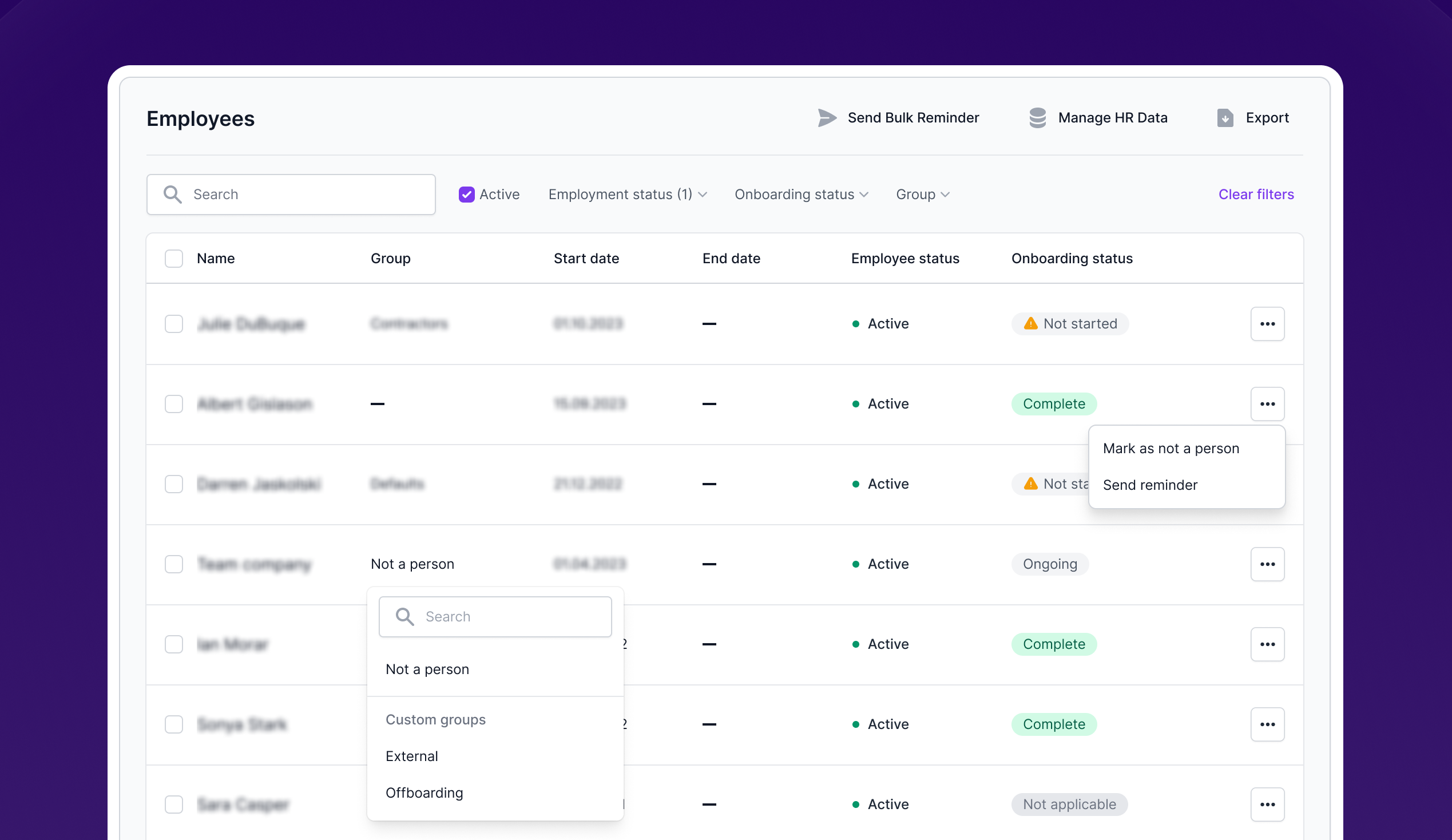When you mark an account as "Not a person," their employee group is automatically updated.