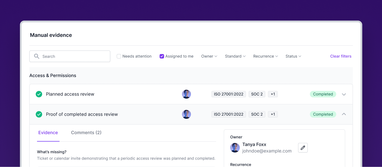 This week, we rolled out updated filters on the Manual Evidence page to bring consistency with other pages and make filtering easier. You can now quickly narrow down the list to show items that need attention, are assigned to you, or filter by owner, standard, recurrence, or status.
